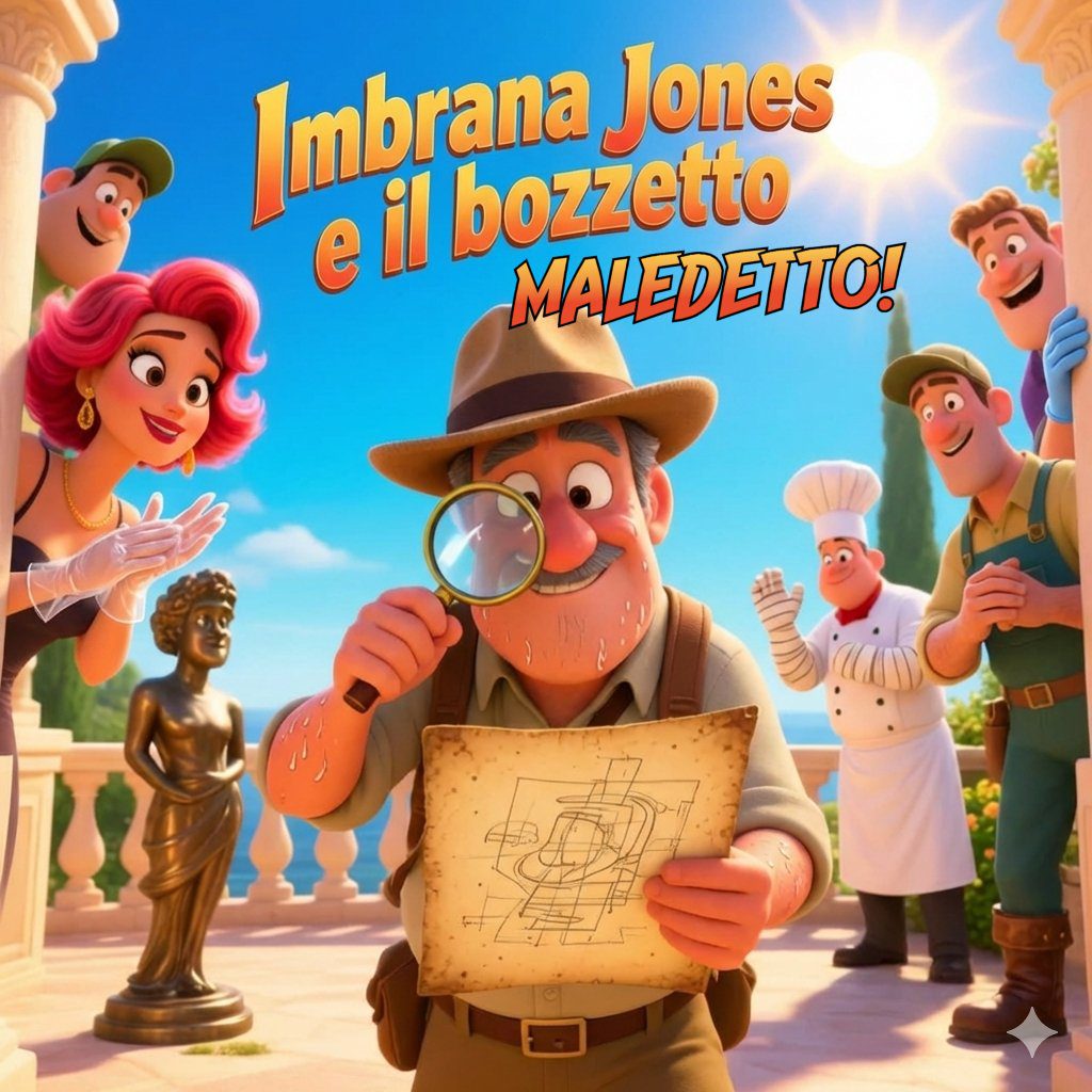 Nella lussuosa cornice di una villa a Beverly Hills, il leggendario (e goffo) archeologo Imbrana Jones ha messo le mani sul ritrovamento del secolo: un inedito e inestimabile bozzetto di Leonardo da Vinci. Sotto il sole cocente di un pomeriggio d’agosto, la terrazza della villa diventa il palcoscenico di una trattativa da cinquanta milioni di dollari con l’eccentrico produttore hollywoodiano Marcus. Ma il destino ha in serbo un colpo di scena brutale: Imbrana viene trovato senza vita, ucciso da una pesante statuetta di bronzo, e il prezioso disegno scompare nel nulla.